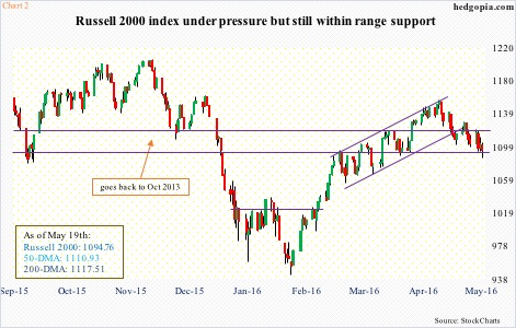 That said, the Russell 2000 has not yet lost the 1090-1120 range, which goes back to October 2013 (Chart 2). Should small-cap bulls decide to put their foot down, this is a perfect spot to do so.