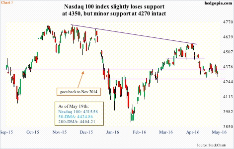 There is a similar dynamic at work on the Nasdaq 100, which retreated in November last year after scoring an all-time high. Its recent high was on April 19th – once again, lower highs – and lost 6.4 percent through the intra-day low on May 6th. As is the case with the Russell 2000, the Nasdaq 100 has lost both its 50- and 200-day moving averages.