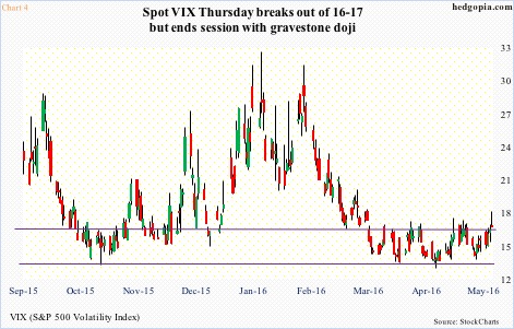 Spot VIX (16.33) has been bound by 16-17 for a couple of months now. This is an important level going back two decades. Historically, once VIX gets over this resistance, it has tended to rally – rally good. But first it has to get over that ceiling, and that probably does not happen until the three indices above fail to save their respective support levels.