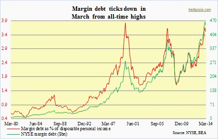 NYSE margin debt declined slightly to $450.3bn in March from February’s all-time high of $465.7bn. This is a minor drop, but going by the two major previous peaks this millennium, this has the potential to be an important reversal in trend. It is too soon to declare that, of course. Central-bank activism – particularly in the U.S., Eurozone and Japan – continues to distort how investors view/avoid risk.