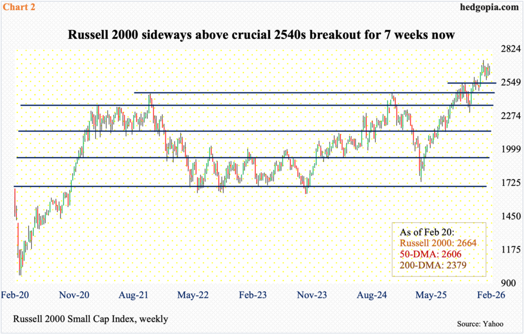 In January, the Russell 2000 reached a new intraday high of 2735 on the 22nd, but only to then finish with a weekly shooting star. Just a couple of weeks leading up to that, the small cap index had broken out of 2540s; the breakout was just about retested three weeks ago, with a low of 2569.