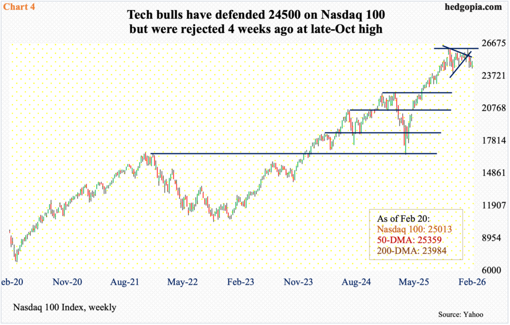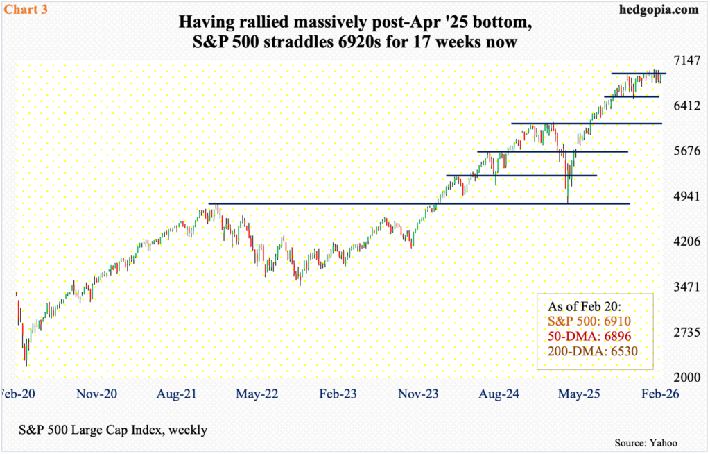 On 29 October, the S&P 500 ticked 6920, having rallied from the April bottom of 4835 (Chart 3). Last week, it rose 1.1 percent to 6910. In the intervening period, the large cap index rallied all the way to 7002, which was tagged on 28 January, but on several occasions before and after that, rally attempts stopped at 6990s, one of which occurred on the 11th this month. Trendline resistance from last month’s record, and touching this month’s high, extends to 6960. It is possible the S&P 500 rallies toward this in the near term, which would also mean 6920s gets reclaimed.