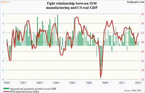 The weak ISM report was apparently taken to mean that the Fed would find it hard to hike come September 20-21. ISM does tend to correlate with GDP (Chart 1). A day later, on Friday, investor reaction was similar.