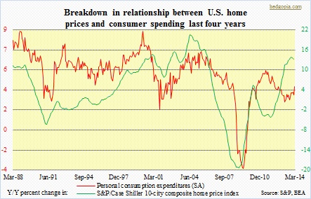 Low interest rates have also lit a small fire underneath home sales. Home prices have rebounded. Mortgage rates are higher from the lows of one year ago, yet historically they are still very low. Yet, recent data suggests wind may be coming out of housing sails. For the average consumer, home prices perhaps matter more than stock prices. In the accompanying chart, the correlation between personal consumption expenditures and the S&P/Case Shiller 10-city composite home price index is 0.86, though there has been some breakdown in this relationship in recent years. Since November last year, y/y increase in the index has been ticking down.