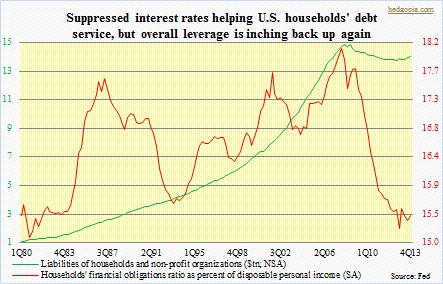 If business is hesitant, and consumers aggressive, then a natural question arises about the sustainability of this trend. As the middle chart shows, consumers have benefited greatly from Fed-engineered low interest rates. There has been a sharp drop in the household financial obligations ratio (which encompasses payments on outstanding mortgage and consumer debt, auto lease payments, rental payments on tenant-occupied property, homeowners’ insurance, and property tax payments, and is calculated as a ratio of debt payments to disposable personal income). Lower debt payments have probably encouraged them to once again begin to take on more debt. Liabilities of households and non-profit organizations peaked at $14.6tn in 3Q08 – for reference, 10 years prior to that, this number stood at $6.1tn – bottomed at $13.5tn in 3Q12 and is inching back up again, at $13.8tn by 4Q13. There is progress on the home mortgage front – from $10.7tn in 1Q08 to $9.4tn in 4Q13 – but at $3.1tn consumer credit is at all-time highs. The point is, the current trend is unsustainable given trends in employment and what is occurring in the labor force.