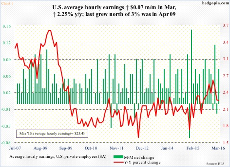 In March, average hourly earnings of private-sector employees were $25.43, up $0.07 month-over-month, and up 2.25 percent year-over-year.  Y/Y growth has been decelerating since 2.64 percent last December.  The last time earnings grew with a three handle was in October 2009 (Chart 1).