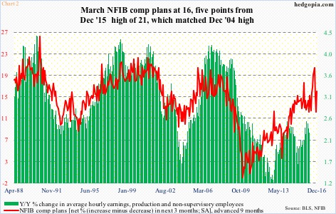 In Chart 2, y/y percent change in average hourly earnings of private-sector production and non-supervisory employees has been plotted against National Federation of Independent Business (NFIB) comp plans.  The latter is advanced by nine months.  A couple of things jump right out in the chart.