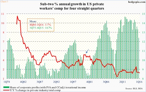 The irony is, the red line in Chart 3 is much weaker versus history, even as the green bars are much stronger versus the historical average.  The latter is essentially corporate margins, which at 12.2 percent in 4Q15, has been under gradual pressure the past four years.  Corporates’ share of profits is dropping not because they are doling out more in wages and benefits.