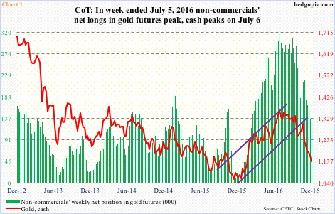 Back in the week ended July 5 this year, non-commercials enthusiastically held 315,963 net longs in gold futures. That was an all-time high. These traders had been aggressively building positions since the week ended December 1 last year, when net longs bottomed at 9,750 contracts; spot gold bottomed at $1,045.4/ounce on the 3rd that month.