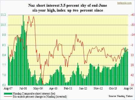 NYSE Composite short interest in the middle of August was essentially unchanged month-over-month at 14.8bn, while the Nasdaq Composite saw a 2.4-percent decrease at 8.6bn. The adjacent chart and the one below show how short interest has been building up on both indices since the beginning of the year. This is in contrast to last year when there were substantially fewer party poopers. In 2013, the Nasdaq shot up 38 percent, and the NYSE 23 percent; short interest rose five percent and four percent, in that order. This year is different. Year-to-date, these indices are up nine percent and six percent, respectively; short interest is up 14 percent (18 percent if end-June high is considered) and 10 percent, respectively. If not for the short selling, equities would probably be even higher this year. On the other hand, the presence of short interest has also helped cushion the blow of any pullback in equities. Early August, equities stabilized after a two-week drop and turned sharply higher. As stated earlier, in the most recent period Nasdaq short interest dropped 2.4 percent, suggesting some short-covering. The question is, are the bulls in a position to orchestrate more squeezing?