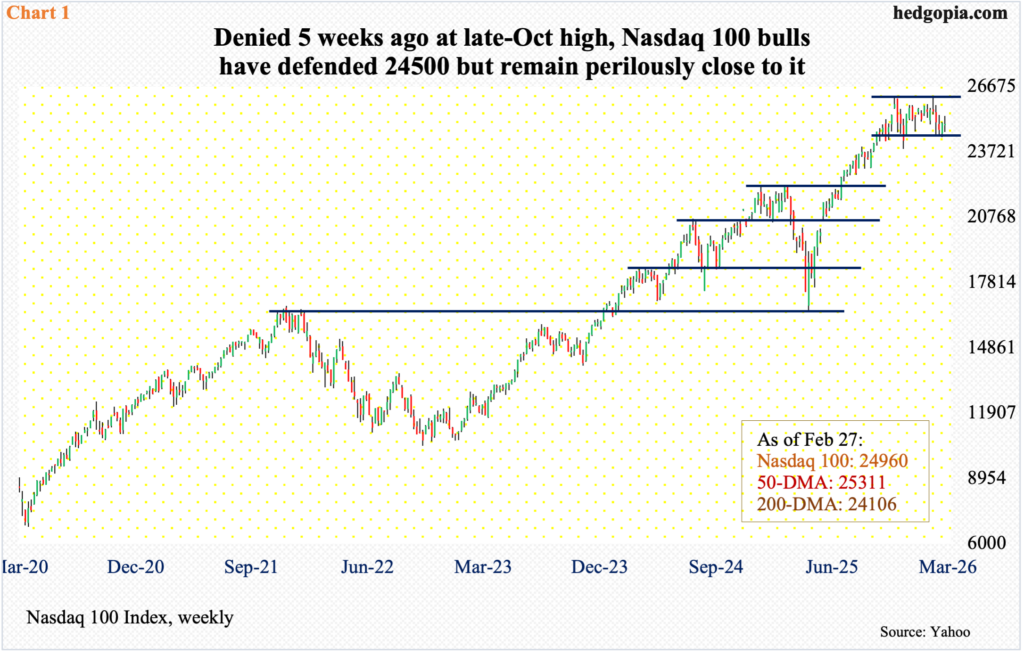 Last week, the index gave back 1.2 percent to 2632, with a high of 2680 and a low of 2601, helping form a weekly spinning top – one of the three in a row. Looking at the way the index is trading, 2540s is likely to be retested sooner than later. It is a must-save for the bulls, and for risk-on sentiment. A hit to risk-on sentiment will be welcomed by Nasdaq shorts.