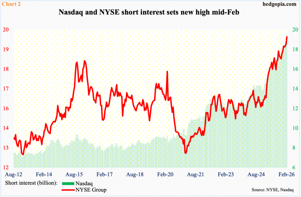This also holds true for the NYSE Composite, where short interest hit a fresh high mid-February, reaching 20 billion. At the end of October, the count was 18.6 billion.