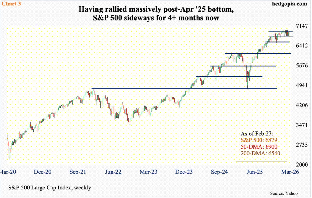 Last week, the S&P 500 shed 0.4 percent to 6879, with 6800 drawing bids on Monday and Tuesday, with a low of 6815, and Wednesday’s high 6953 denied at the falling trendline from 28 January when the index posted a new all-time high 7002. When it was all said and done, the 50-day at 6900 was breached by Friday. For the week, a spinning top was formed. This was the fourth time this candle showed up in the last seven weeks (Chart 3).