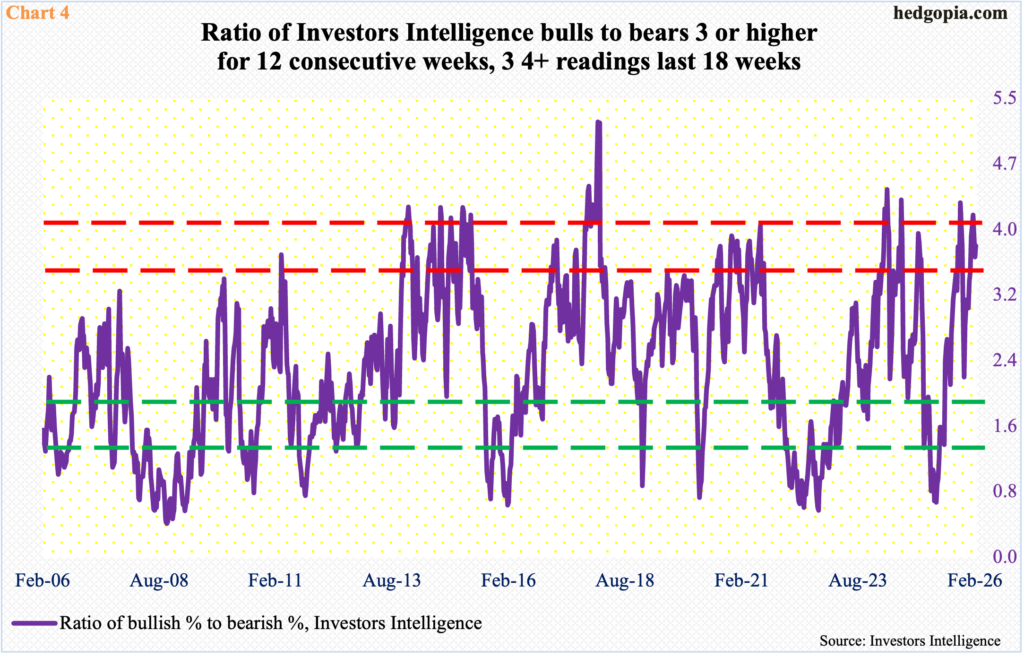 In the week to last Tuesday, Investors Intelligence bullish percent expanded nine-tenths of a percentage point week-over-week to 55.6 percent – one of the 13 consecutive weeks in which the reading was north of 50 percent, with two readings of 60-plus percent in late January-early February.