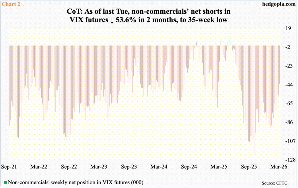 Amidst this, in the futures market, non-commercials are actively cutting back on their holdings of net shorts in VIX futures, to 42,835 contracts as of Tuesday, down from 71,817 as of 17 February and 92,363 as of 13 January (Chart 2).