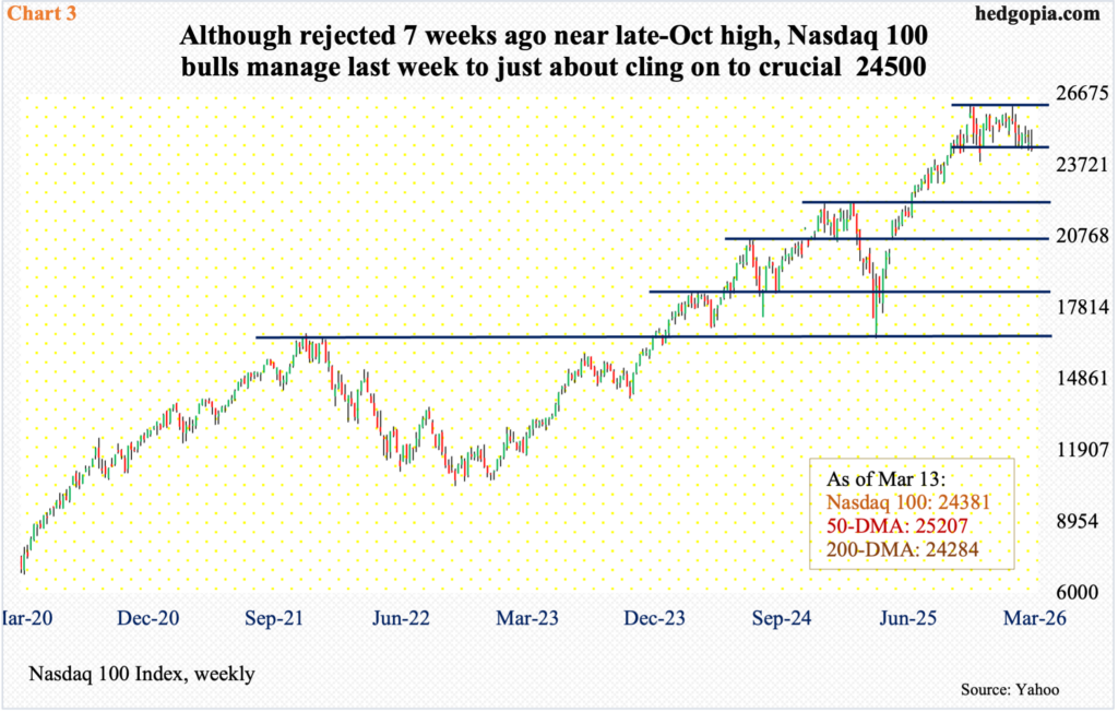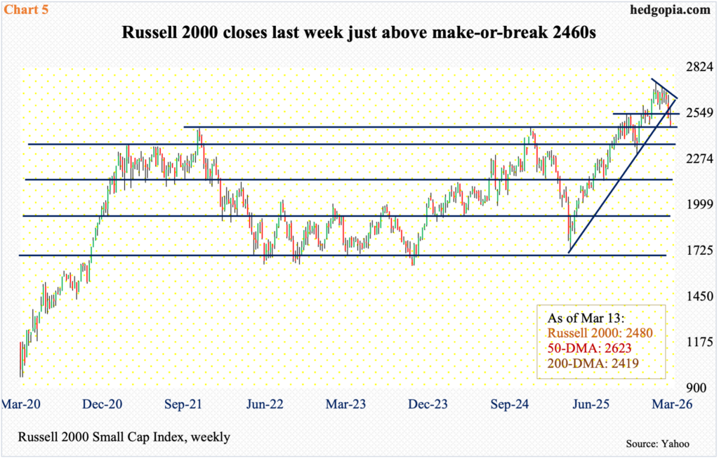 Last Monday, the index tagged 2463 intraday, closing the week at 2480, down 1.8 percent for the week. Failure to save 2460s will raise the odds the index will at least gravitate toward the 200-day at 2419. It is already under the 50-day at 2623.