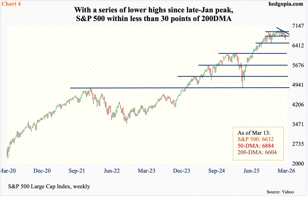 The S&P 500, too, finished last week just above its 200-day (6604). Down 1.6 percent to 6632, it closed right at lateral support at 6630s.