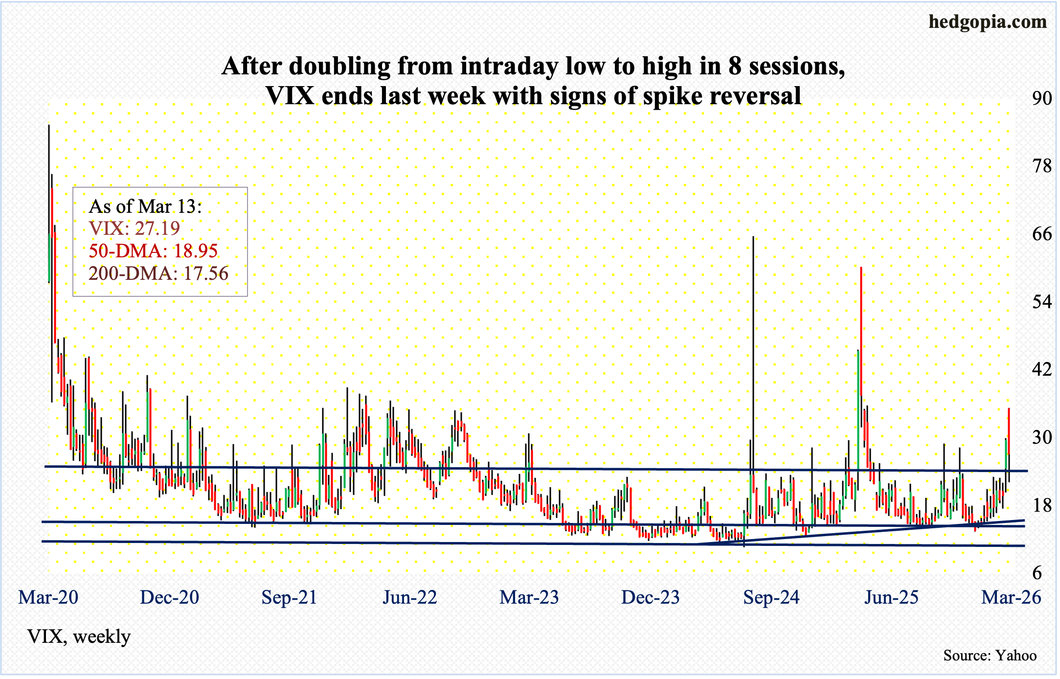 From intraday low to high, VIX doubled in eight sessions. Tagging 17.50 on 26 February, it touched 35.30 last Monday, although volatility bulls failed to keep that high, with the session reversing lower to close at 25.50. By Friday, VIX lost 2.30 points for the week to 27.19. This was the first down week in three, and second in nine (Chart 1).