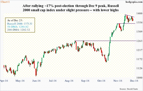 U.S. small-caps have had a phenomenal run post-election. From November 8 close through the intra-day all-time high 1392.71 on December 9, the Russell 2000 small cap index jumped 16.5 percent. It has come under slight pressure since that high, but nothing major – not yet anyway.