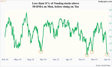 Chart 2 plots the percent of Nasdaq stocks above the 50-day moving average, and it is darn low – less than 11 percent on Monday. The prior three circles in the chart indicate important bottoms – mid-October 2014, late-August 2015, and late-August 2015. The spring is compressed.