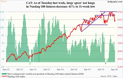 Non-commercials are yet to start aggressively getting net long Nasdaq 100 index (mini) futures. They are net long, but have been cutting back particularly since early November last year. As of Tuesday last week, they held nearly 36k contracts, down 41 percent week-over-week (Chart 3). That was prescient. In the week ended yesterday, the index lost 3.5 percent. It is possible this, combined with the price action Monday, has coaxed these traders into adding longs. We will find out this Friday.