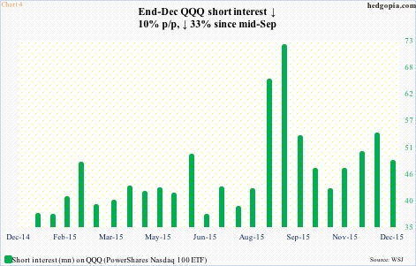 Back in late September last year, the bears helped propel the rally in the Nasdaq 100. By mid-September, short interest on QQQ had surged to just under 72 million – the highest since the end of October 2014. This time around, it had been building since the end of October last year, but declined 10 percent in the latest period. The potential short-squeeze fuel is nowhere near the mid-September high (Chart 4). That said, should a rally ensue in the Nasdaq 100, there is room for a mini-squeeze.