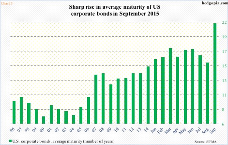 Corporations have taken advantage of this, by continuously extending debt maturity. As early as 2004, the average maturity of corporate bonds stood at 7.4 years, rising to 14.7 last year. Through August, March’s 17.5 years was the highest. Then came September, which shot up to 21.3 years (Chart 5). This is a positive, and kudos to corporate treasurers for achieving this, although it is a no-brainer.
