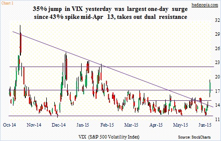 After weeks of sideways action, VIX, the S&P 500 Volatility Index, surged nearly 35 percent yesterday, to 18.85. As is obvious, a daily move of this magnitude is quite rare. The spike yesterday was the largest one-day move since April 15, 2013, when the fear index surged 43 percent.