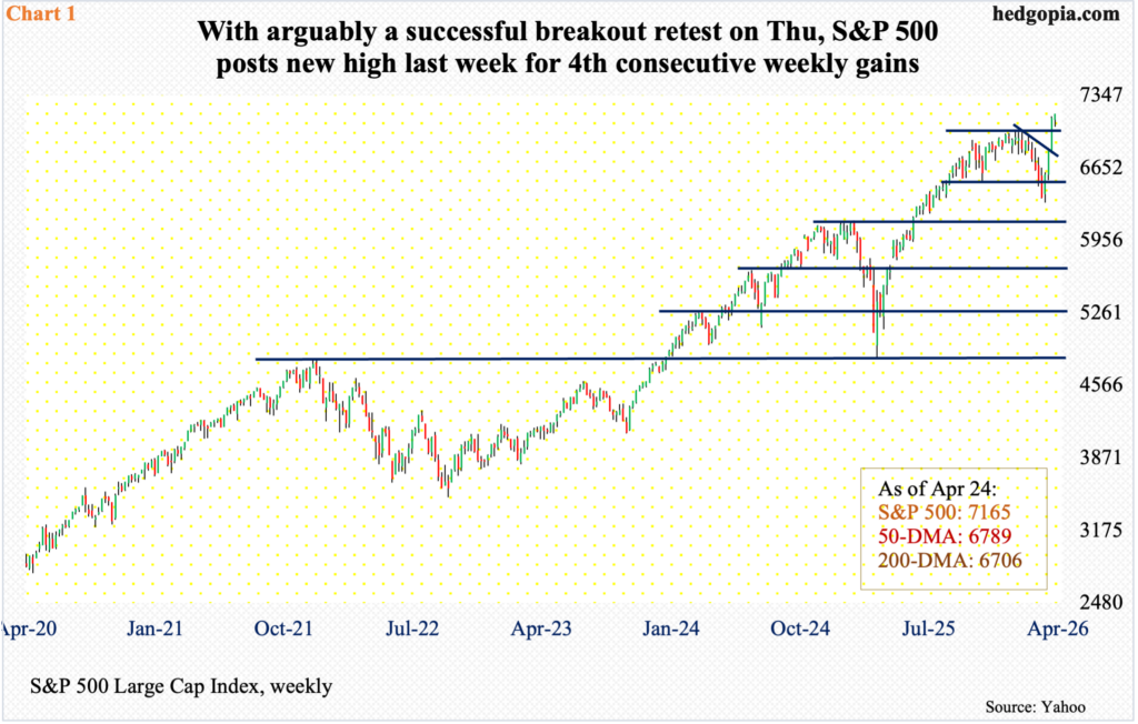 The S&P 500 continued on its merry way last week, having now rallied for four weeks in a row (Chart 1). It bottomed at 6317 on March 30 and finished the week up 0.6 percent to 7165, with an intraday high of 7169 on Friday.