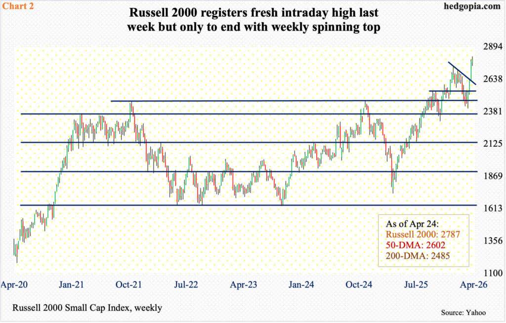 U.S. equity indices logged another week of gains. They bottomed on March 30. Amidst this feverish risk-on behavior, some early signs of risk-off showed up last week. Tech and small-caps both rose, with the Nasdaq 100 surging but the Russell 2000 unable to cling on to its high to form a weekly spinning top.