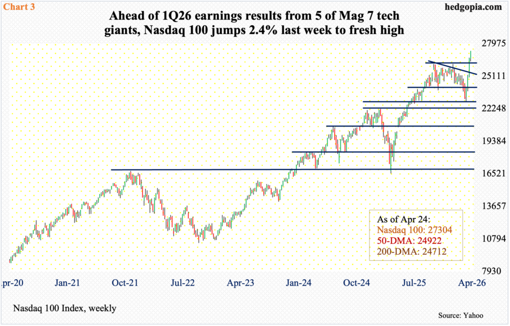 Tech gave off different vibes last week, continuing to exhibit risk-on. The positive momentum has now gone on for five weeks (Chart 3). Between the intraday low of 22,841 on March 30 and last week’s closing print of 27304, the Nasdaq 100 has shot up 19.5 percent, more than erasing the 12.8-percent loss between the October 29 high of 26182 and last month’s low.