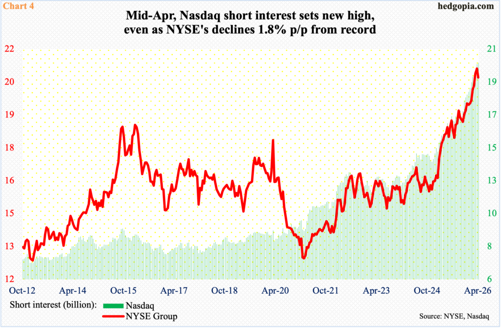 Mid-April, Nasdaq short interest rose 0.5 percent period over period to 20.5 billion – a record; on the NYSE, however, it dropped 1.8 percent p/p to 20.5 billion, but the prior period’s 20.9 billion was a record (Chart 4).