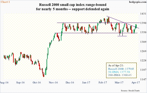 Most recently, the Russell 2000 dropped to the bottom of the range on the 13th this month. By the 20th, it was already knocking on resistance, in the process breaking out of a declining trend line from March 1 when it rose to the all-time high 1414.82 (Chart 1).