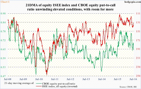 Along the same lines, the 21-day moving average of the ISEE, all equity, call-to-put ratio (hence inverted in Chart 1) has been once again rising in the past three sessions.