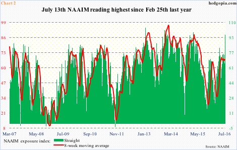 There is a variety of surveys geared toward measuring investor sentiment, such as Investors Intelligence, American Association of Individual Investors, Market Vane, etc. The National Association of Active Investment Managers (NAAIM) puts out a weekly survey showing members’ exposure to U.S. stocks. Unlike purely opinion-based surveys, this one involves real money.