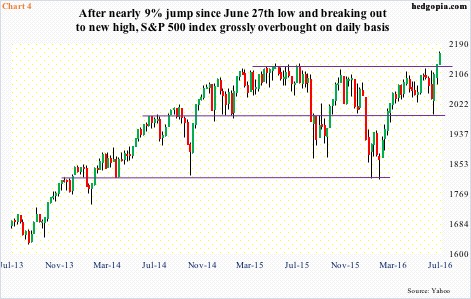 Accordingly, both the S&P 500 large cap index and the Dow Industrials have broken out to new highs. The S&P 500 (2161.74) in particular has rallied nearly 20 percent since February lows. Post-Brexit, it shed 5.3 percent in two sessions, but off the June 27th low has rallied nearly nine percent … in 13 sessions! In doing so, the index broke out of months-long sideways move, which can be traced back to March last year (Chart 4).