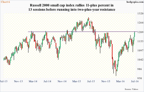 Post-Brexit, the Russell 2000 found support at 1080, then rallied 11-plus percent in 13 sessions. This has brought the index right under horizontal-line resistance drawn from March 2014 (Chart 6). Regardless it breaks out or not near term, its underperformance versus larger peers is a reflection on how markets view where the economy is headed.