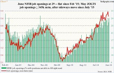 Chart 7 plots two sets of data pertaining to job openings – one out of the JOLTS report and the other from the National Federation of Independent Business. Both have been experiencing rather sideways tendency for a while now.