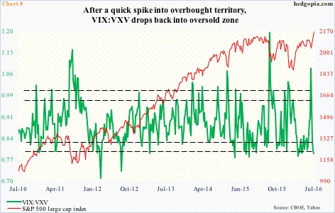 Going back five quarters to 1Q15, except for 4Q15, the S&P 500 was higher within a month of quarter-end. This phenomenon is once again at play. But with this, technicals have gotten extended, raising the odds that the green line in Chart 8 begins to unwind its oversold conditions. Spot VIX last Thursday dipped to 12.14 – the lowest since August 5th last year.