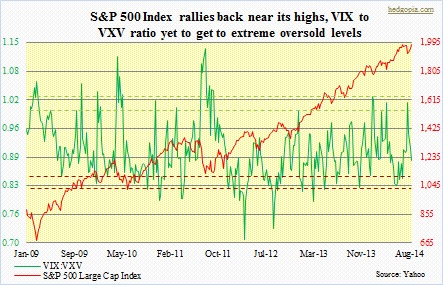 And then there is this. As can be seen in the chart above, the VIX:VXV ratio has room to go lower. The VIX of course measures S&P 500 volatility one month out, while the VXV is a measure of three-month implied volatility. Normally, the ratio tends to bottom out in the high-.70s to low-.80s range. The VXV has tended to be less volatile. One of the ways the ratio can drop is if the numerator drops faster than the denominator. From the recent highs, the VIX has dropped 32 percent, and the VXV 24 percent. While it is possible this pattern continues, the message coming out of the CBOE put-to-call ratio is even more interesting. In the adjacent chart, the green line began to turn up even as the S&P 500 Index began a sideways action early July. It is nowhere near close to getting to overbought conditions. But it also rose from a very low level – third lowest in the last one decade. Two outcomes are possible: (1) the 21-day moving average continues to move up, which would mean the rally in the S&P 500 stops soon, or (2) it turns lower, which, by the way, just got underway. In a latter scenario, the index continues higher. Going back a decade, this has happened once. Back in April 2010, the average turned up from a deeply oversold level, and peaked two weeks later (marked by a circle in the chart), preceding a rally in equities.