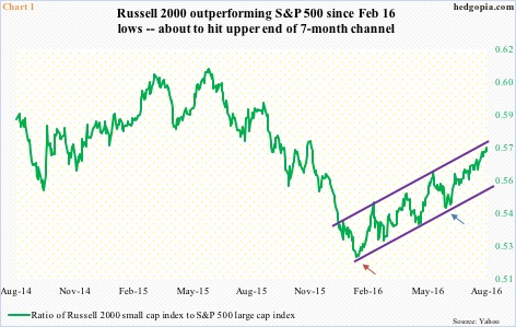 Small-caps are catching up. In fact, the ratio of Russell 2000 to S&P 500 bottomed in early February this year when major U.S. indices troughed. Since then (burgundy arrow in Chart 1), the ratio has been in an uptrend, with the latest bounce coming off post-Brexit low (blue arrow). The ratio currently is spitting distance away from hitting the top end. Odds favor it turns back from here.