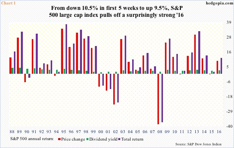From that anemic opening weeks to up 9.5 percent when it was all said and done, 2016 turned out to be an above-average year (Chart 1).  (Post-election alone, the index added 4.6 percent.)