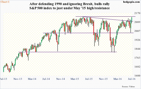 Since July 1st, the S&P 500 (2129.9) is up 1.3 percent, and had back-to-back hammer weeks (Chart 1).  The two-session, 5.3-percent Brexit decline has been completely erased.  Both 50- and 200-day moving averages have been recaptured, with the index right underneath the May 2015 high.