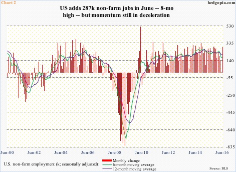The U.S. economy added 287,000 non-farm jobs in June – an eight-month high.  Having come on the heels of what was previously reported as 38,000 in May – now revised down to a mere 11,000 – the June jump soothed investor nerves.  That said, momentum is still in deceleration, with the 6-month moving average below that of the 12-month in 12 out of the last 16 months (Chart 2).
