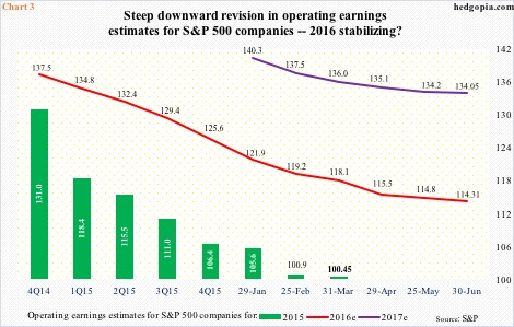 Back in 2Q14, 2015 operating earnings for S&P 500 companies were estimated at $137.50.  When it was all said and done, actual earnings came in at $100.45, down from $113.02 in 2014.  Along the same lines, 2016 estimates in 4Q14 were, once again, $137.50.  They have now been chopped down to $114.31.  The latest data is as of June 30th.Screen Shot 2016-07-10 at 2.30.07 PM