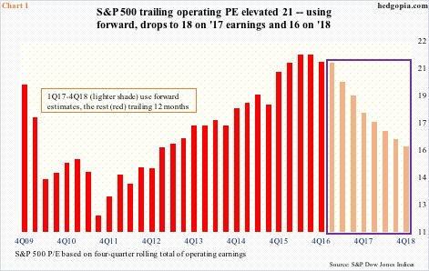 The resultant jump in P/E does not look as bad if we were to use forward earnings. Operating P/E contracts to 18x using $2017’s estimated $130.65 and to 16x using next year’s $146.98 (Chart 1).