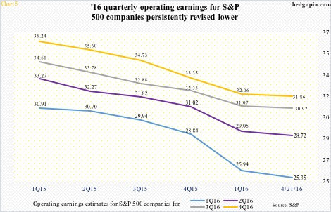 The point is, it has been customary to have lofty expectations at the beginning, and then see estimates persistently revised lower. The dollar has been partly responsible for this. Beginning July 2014 through the afore-mentioned March 2015 high, the dollar index surged 25-plus percent. In a mere nine months!