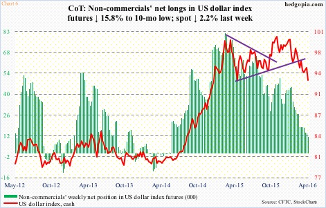 Thus far, that is also the message coming from non-commercials’ net longs in US dollar index futures. As of Tuesday last week, holdings were at a 10-month low (Chart 6). Incidentally, back in March last year, peak in net longs coincided with peak in the US dollar index. If and when they switch their bias and start adding to net longs, that will be a development worth watching. Further, it will be interesting to see how these traders reacted to the Friday breakdown last week.