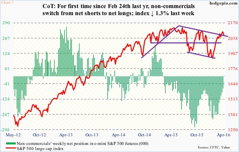 Speaking of which non-commercials have done quite an about-face when it comes to how they are positioned as relates to e-mini S&P 500 futures. For the first time since February 24th last year, they are now net long (Chart 7). It is only 1,460 contracts, but symbolically it is huge.