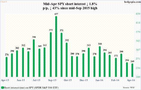 On SPY, the SPDR S&P 500 ETF, for example, short interest has been in decline since the middle of September last year. From February 12th through April 15th, it dropped 12.6 percent, to 249.4 million – the lowest since the end of March last year (Chart 8). What was once a tailwind for stocks is turning into a potential headwind.